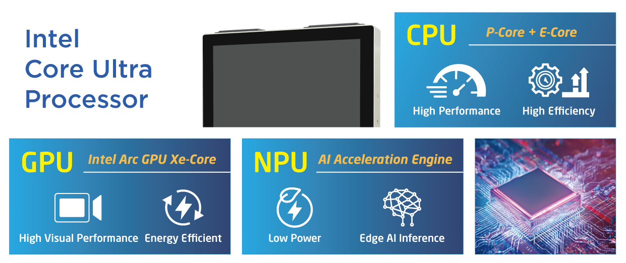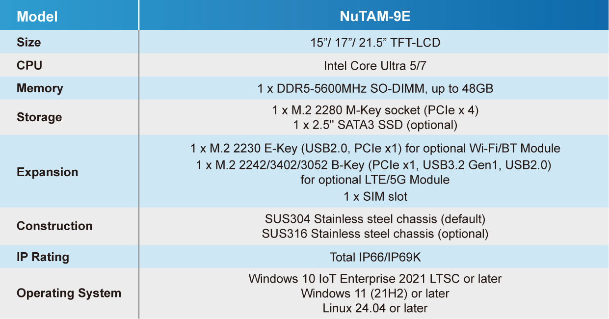 The NuTAM-9E is available in three display sizes — 15”, 17”, and 21.5” TFT-LCD — and is powered by Intel Core Ultra 5/7 processors. Built on the Intel 4 compute tile technology, the Core Ultra features a hybrid architecture of Performance-cores (P-cores) and Efficient-cores (E-cores), integrating CPU, Intel Arc GPU, and NPU capabilities. It enables high-performance graphics computing, intelligent analytics, and real-time AI applications, ensuring optimized performance, efficient multitasking and outstanding responsiveness.