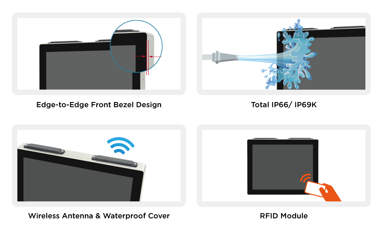 The NuTAM-9E combines the design advantages of the PhanTAM and ViTAM series, featuring an edge-to-edge front bezel with a truly flat, seamless, and lightweight design for a modern look. It offers total IP66/IP69K waterproof and dustproof protection, capable of withstanding high-pressure water jets up to 100 bars at 80°C. Additionally, it provides robust wireless antenna covers and M12 connectors to prevent bending damage and water ingress. APLEX also offers optional IP67 extension cables and adapters for use in harsh environments.