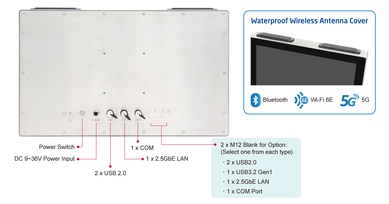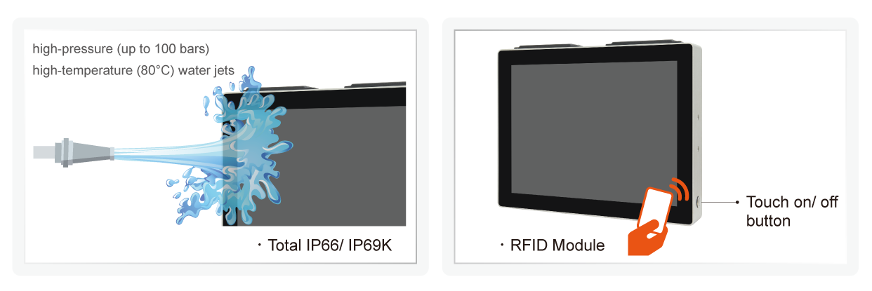The NuTAM-8C series is specifically designed for environments where hygiene is critical. Featuring robust SUS304/ SUS316 stainless steel enclosure with an edge-to-edge true flat front bezel, the system effectively resists corrosion, oxidation and bacteria accumulation, making it ideal for hygienic industrial applications. Designed to meet the highest protection standards, the NuTAM-8C series is certified to total IP66/ IP69K waterproof and dustproof, it can withstand intense washdown using high-pressure (up to 100 bars) and high-temperature (80°C) water jets. M12 waterproof connectors, protective caps, and waterproof antenna covers providing extra protection against moisture ingress, while a side touch on/ off button allows uninterrupted operation during cleaning processes.
