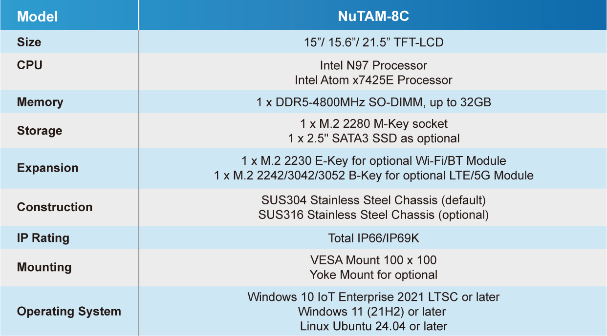 [Taipei, Taiwan-January, 2026]-APLEX Technology Inc.,a global provider of industrial computing solutions, is thrilled to introduce the upcoming NuTAM series lineup - the NuTAM-8C. Designed for high-hygiene industrial environments, the NuTAM series supports multiple processor platforms, offering a full spectrum of performance options. From the Intel core ultra-powered NuTAM-9E to Intel Alder Lake-N powered NuTAM-8C, APLEX provides a complete range of TFT-LCD panel sized from 15” to 21.5”, ensuring flexibility across diverse applications.